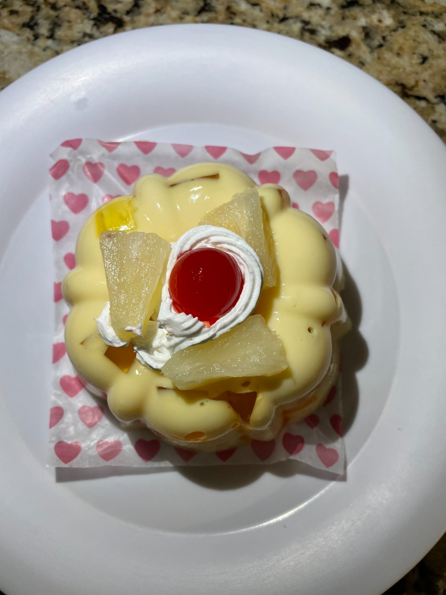 Refrescante y cremosa, nuestra gelatina de piña colada es el postre perfecto para cualquier ocasión. Trozos de gelatina de piña y gelatina de durazno se combinan con jugosas cerezas y trozos de piña natural, creando una explosión tropical en cada cucharada. En el centro la suave crema batida corona esta delicia, aportando un toque ligero y dulce que complementa a la perfección los sabores frutales.
